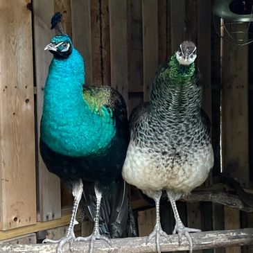 Jack and Chrissy are my peacocks. They hatched in spring of 2023. Jack is just starting to grow his train, and has been dancing for Chrissy, but Chrissy is generally more interested in talking to the chickens...