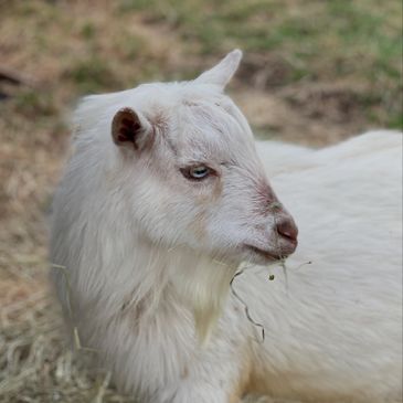 Rogers, Buck Rogers, is my ADGA registered Nigerian Dwarf buck. He is a very handsome young man with a great goatee, blue eyes, and is polled. Sally's three kids born in the spring of 2025 were sired by Rogers and were beautiful and healthy.